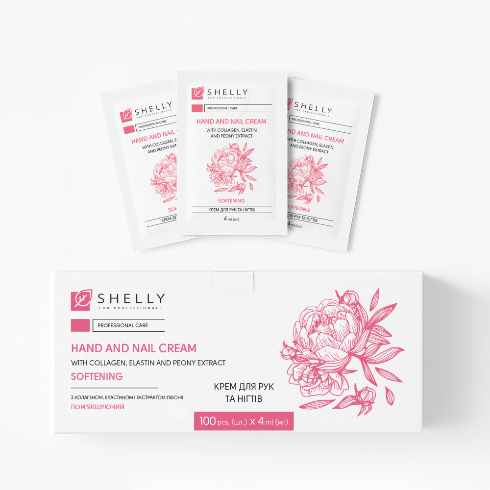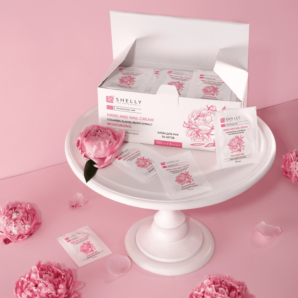 Popis krému na ruce a nehty s kolagenem, elastinem a extraktem z pivoňky Shelly 4 ml × 100 ks