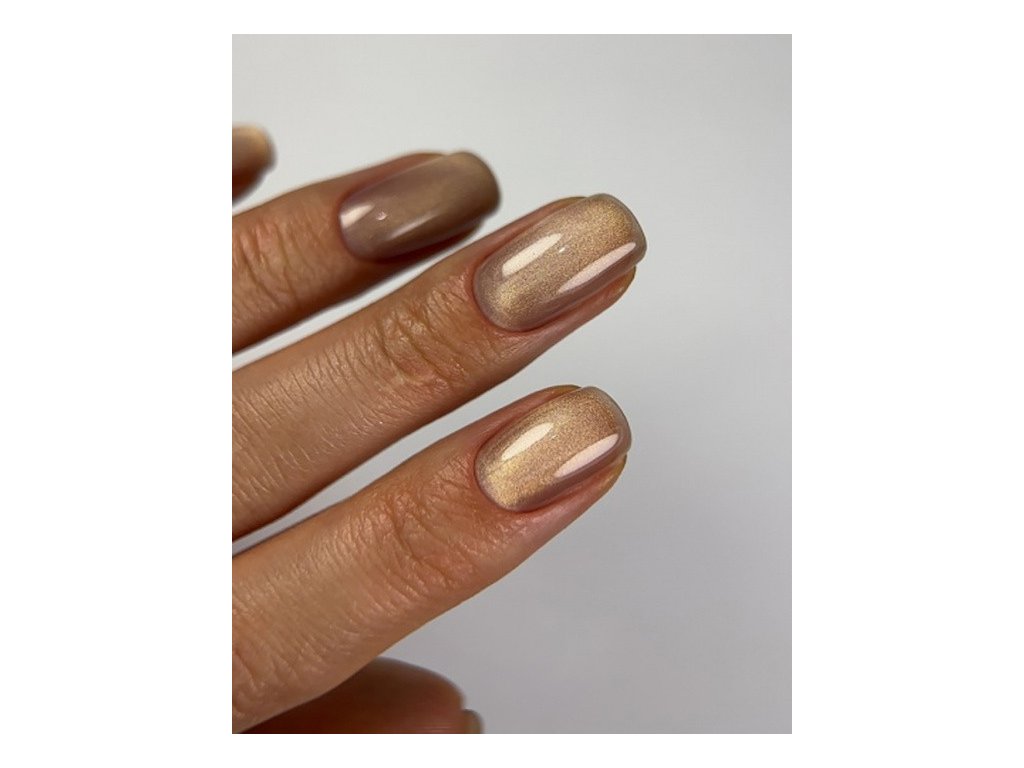 Pro intenzivnější efekt tmavších odstínů doporučujeme podkladovou tmavou vrstvu.Naneste barevný gel lak ve 1–2 vrstvách a vytvořte efekt kočičího oka pomocí magnetu.