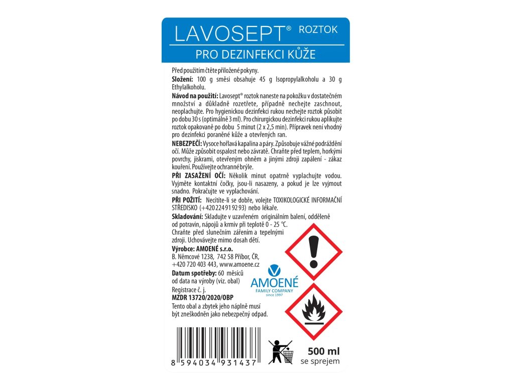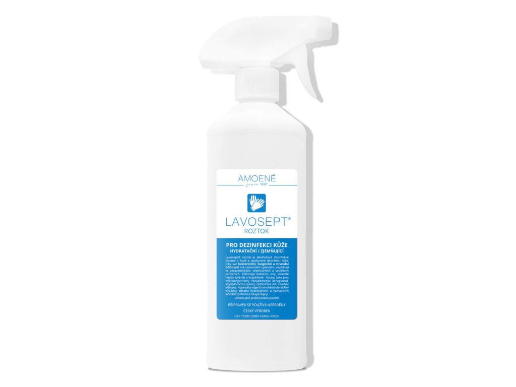 Alkoholový dezinfekční přípravek pro hygienickou dezinfekci kůže. Lavosept je alkoholový dezinfekční přípravek ve formě roztoku, který obsahuje i zjemňující a hydratační přísady, které zabraňují vysoušení a podráždění pokožky. 500 ml náhradní náplň.Lavosept®Lavosept® je alkoholový dezinfekční přípravek pro hygienickou dezinfekci kůže. Dodává se ve formě roztoku nebo čirého gelu, který obsahuje i zjemňující a hydratační přísady, které zabraňují vysoušení a podráždění pokožky.Přípravek Lavosept® je vhodný pro použití všude tam, kde dochází ke kontaktu s velkým počtem osob - v nemocnicích, ordinacích, ve stravovacích provozech, v potravinářských výrobách, v oblasti rehabilitace, v kosmetických salónech při manikúře, modeláži umělých nehtů, pedikúře, tetování kůže, ve sportovních zařízeních, v půjčovnách sportovního náčiní, fitness, wellness, při nákupech v supermarketu, při cestování atd.Dezinfekční účinnost přípravku Lavosept® byla posuzována na Státním zdravotním ústavu v Praze, v Centru epidemiologie a mikrobiologie v Národní referenční laboratoří pro dezinfekci a sterilizaci.Bezpečnostní listy dezinfekce Lavosept od firmy Amoene naleznete v hlavním menu Firemní dokumenty.Doplňkové parametry