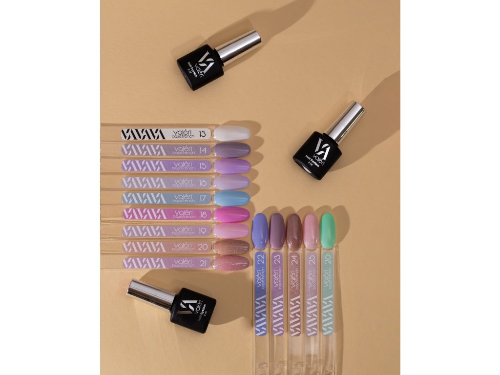 Valeri French Base – is a collection of camouflage and French bases in various shades, consistencies, and densities, from classic nude to rich color tones. They are ideally suited for both French manicure and solid color coverage. All bases are of high quality, well-pigmented, easy to self-level, and have excellent adhesion, ensuring good wear. The bases are universal and contain rubber, have a medium density (on the thinner side), and medium hardness. Thanks to the excellent formula and pigmentation, they cover the nail plate well and cure perfectly under a lamp. They hold excellently for more than 21 days.