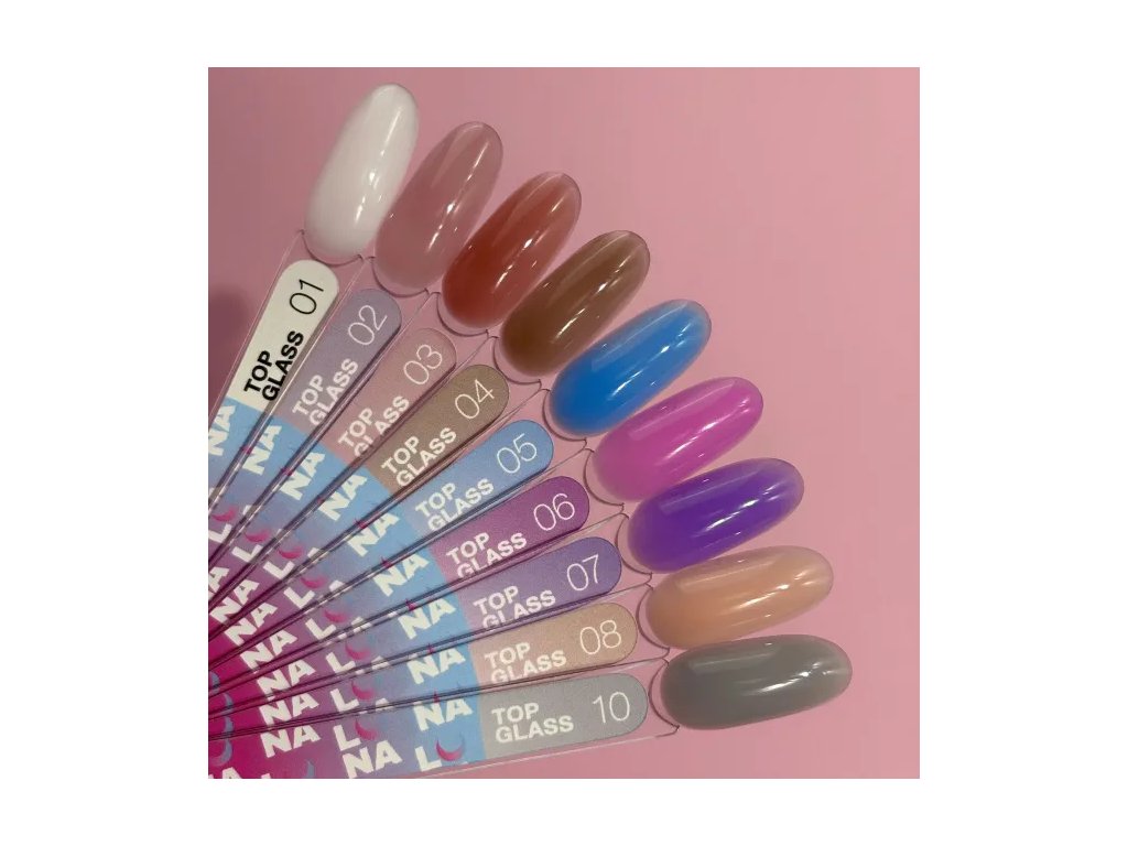 TOP GLASS – colored non-wipe top coats that maintain their shine for up to 4 weeks. They can be used in combination with other products for interesting designs, or alone for a trendy manicure thanks to their color shade.