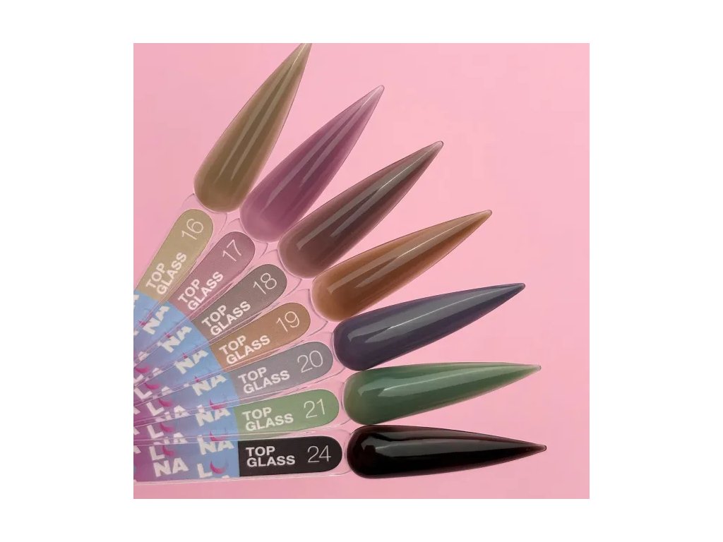 TOP GLASS – colored non-wipe top coats that maintain their shine for up to 4 weeks. They can be used in combination with other products for interesting designs, or alone for a trendy manicure thanks to their color shade.