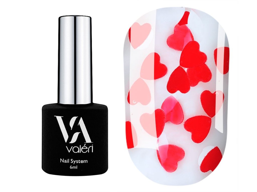 Valeri Top Love is...red is a final no-wipe top coat with decorative red hearts. It has a medium (rather thinner) consistency and reliably protects the nail surface from scratches and other mechanical damage. It contains mild UV filters, making it a universal product – suitable for both light and dark shades. It is easily self-leveling, does not run, does not cause a burning sensation in the lamp, and ensures long-term durability.