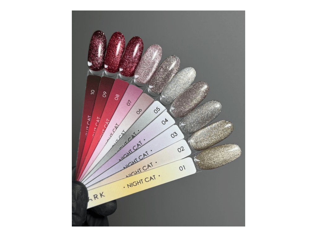 DARK GEL POLISH NIGHT CAT – pigmented colored gel polishes with a “cat eye” effect.