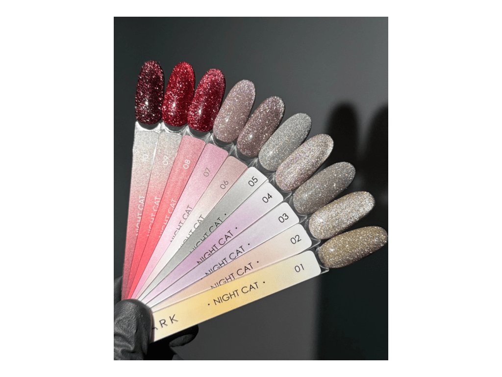 DARK GEL POLISH NIGHT CAT – pigmented colored gel polishes with a “cat eye” effect.