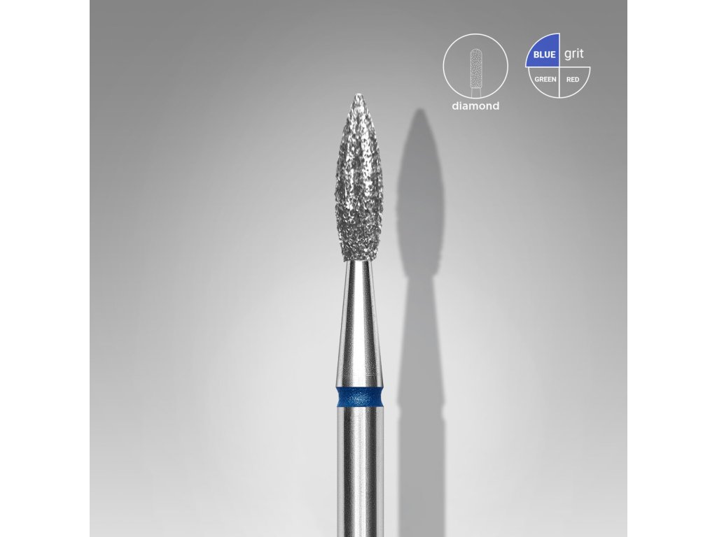 Staleks Diamond Drill Bit pointed - "flame" blue 2.3mm/8mm - FA11B023/8 is a diamond bit with medium grit in the shape of a pointed "flame", with a diameter of 2.3mm and a working part length of 8mm. Designed for processing the cuticle and lateral nail folds without the risk of skin injury.