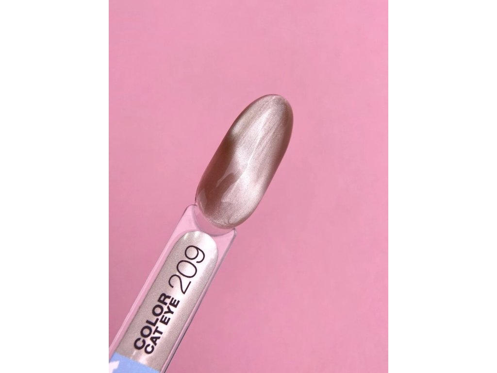 Color Cat Eye is an ideally pigmented gel polish that can be applied in either one or two thin layers. It does not leave streaks during application, self-levels easily, and has a medium consistency. The product's composition contains small metallic particles that react to a magnet, move within the still-unpolymerized layer of coverage, and create a magical shimmer in the design.