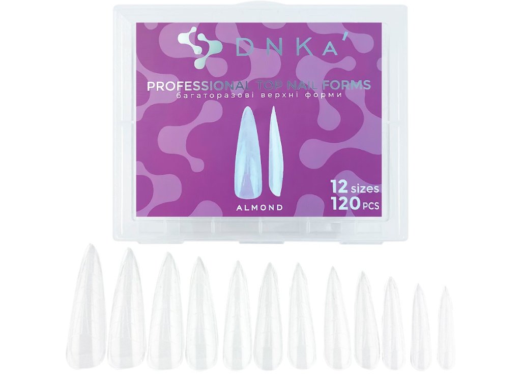 "Almond" salon forms are suitable for creating long almond-shaped nails, allowing for extension, strengthening, and correction of nails of any length. The forms simplify and speed up the specialist's work, reducing surface filing time during extensions, corrections, and nail repairs. The universal form is suitable for creating almond and oval nails. They are made of durable and flexible plastic, easy to remove after polymerization. Ideal for working with DNKa acrylic gel, DNKa Builder gel, and DNKa Jelly gel.
