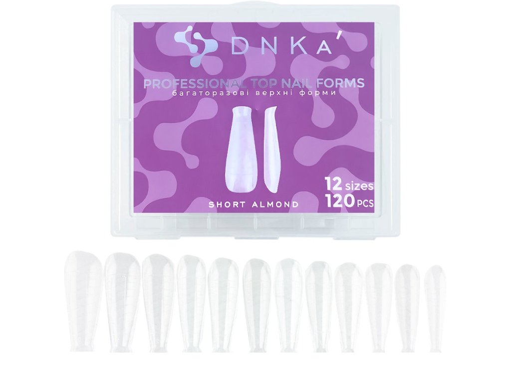 "Short almond" forms are suitable for creating short salon almond nails of natural length and shape. SHORT ALMOND Top Nail Forms allow for the extension, strengthening, and correction of nails of natural length and shape. The forms simplify and speed up the specialist's work, reducing surface filing time during extensions, corrections, and nail repairs. The universal form is suitable for creating almond, oval, and short square nails. They are made of hard yet flexible plastic, easy to remove after polymerization. Ideal for working with DNKa acrylic gel, DNKa Builder gel, and DNKa Jelly gel.