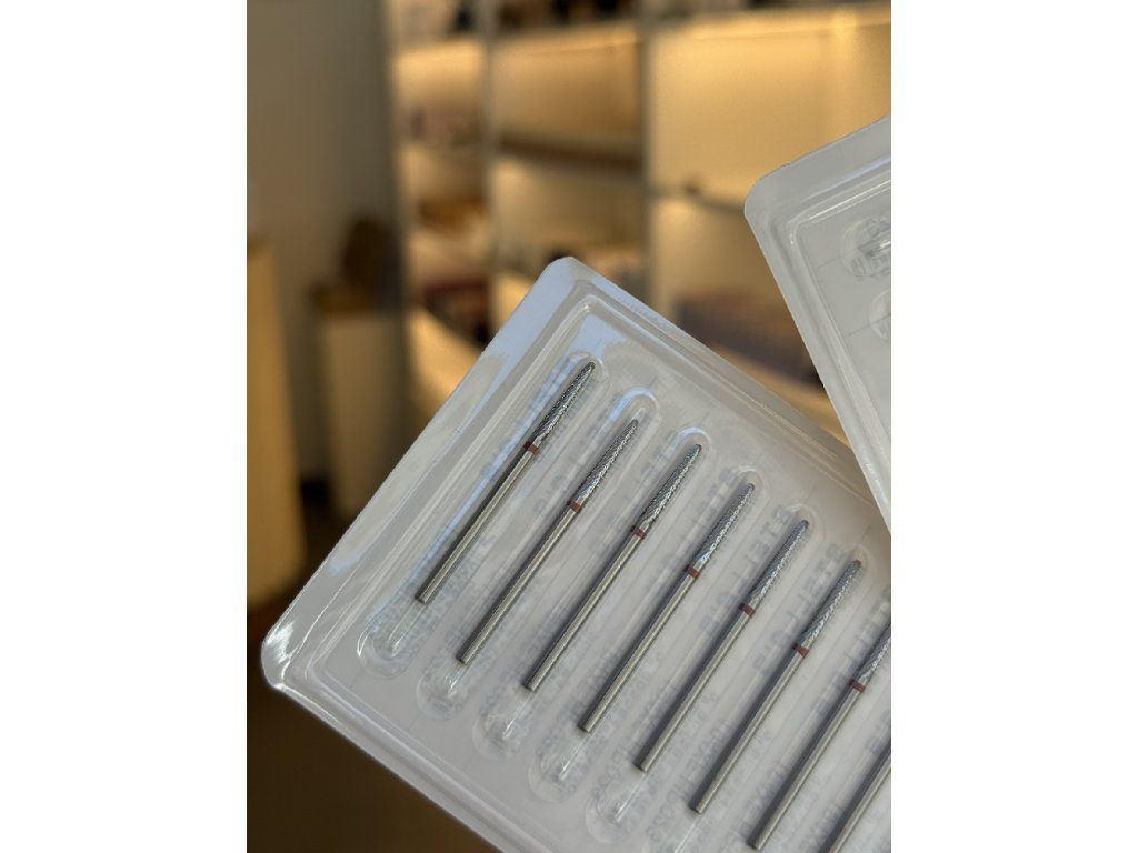The professional STELLA'S carbide drill bit in a thin needle shape with a red band is ideal for delicate and precise work in both manicure and pedicure. Thanks to its narrow tip, it easily reaches hard-to-access areas and allows maximum control during detailed work.