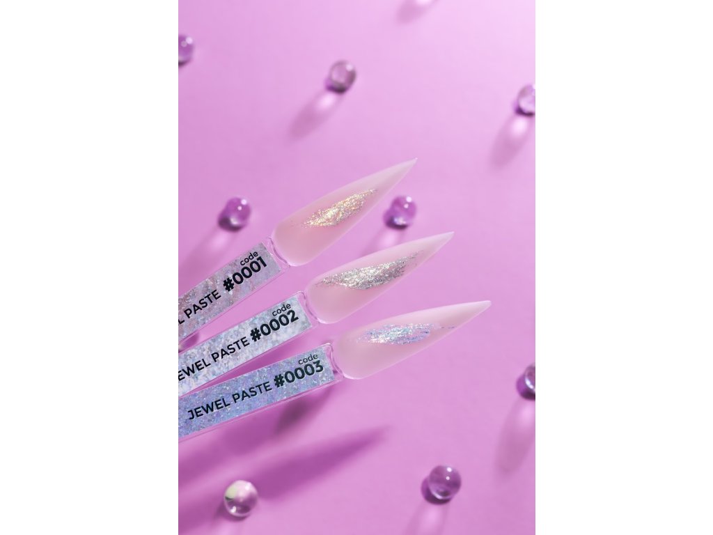 Description: JEWEL Paste is a decorative thick gel paste with incredible shine, thanks to the high pigmentation of pearl particles and the Yuki flake effect. The gel paste can be used to cover the entire nail surface, to perform decorative elements on the top coat surface, as well as a pigmenting gel when mixed with other modeling products, such as Acryl Gel, Builder Gel, Jelly Gel.