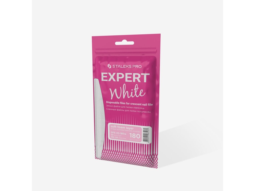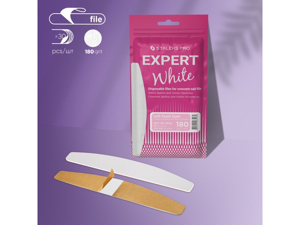 Staleks Expert disposable files DFE-40-180 white are disposable files made from high-quality abrasive material with protection against organic dust. Their foam interlayer reduces pressure on the nail plate.
