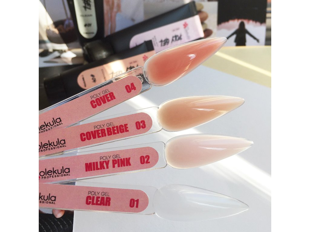 Polygel (or acrygel) is a special material that ideally combines the properties of acrylic and gel. Acrygel has no odor and does not cause allergies. The material is highly versatile, as it is perfect for nail modeling, strengthening, and repairing the nail plate. It does not run during application, but at the same time, it does not self-level and does not cause a burning sensation under the lamp. Acrygel is completely ready to use, so no manipulation with powder or monomer is required.