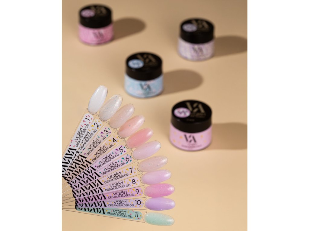 Valeri Gel Dream Collection – a gel collection designed both for nail extensions and for correction and strengthening of the nail plate. The gels are low-temperature, firm, with medium consistency (Valeri gels 3–5 have a slightly thinner consistency), allowing them to self-level very well without running. Pigmentation is medium. They are easy to apply and maintain the nail arch shape perfectly. Valeri gels can be used in both single-phase and three-phase systems. Thanks to their excellent consistency, they can be applied with a no-file technique or with minimal filing.