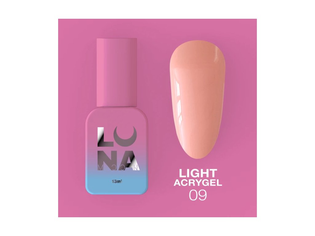 LIGHT ACRYGEL Liquid Gel – an innovative material for strengthening, leveling, and extending nails. It is a combination of polygel and base. Contains 60–80% acrylic copolymer (the main component of polygel) and a smaller amount of hydroxyethyl methacrylate HEMA (approximately 20–30%), the main component of base coats. This gel can completely replace a base.