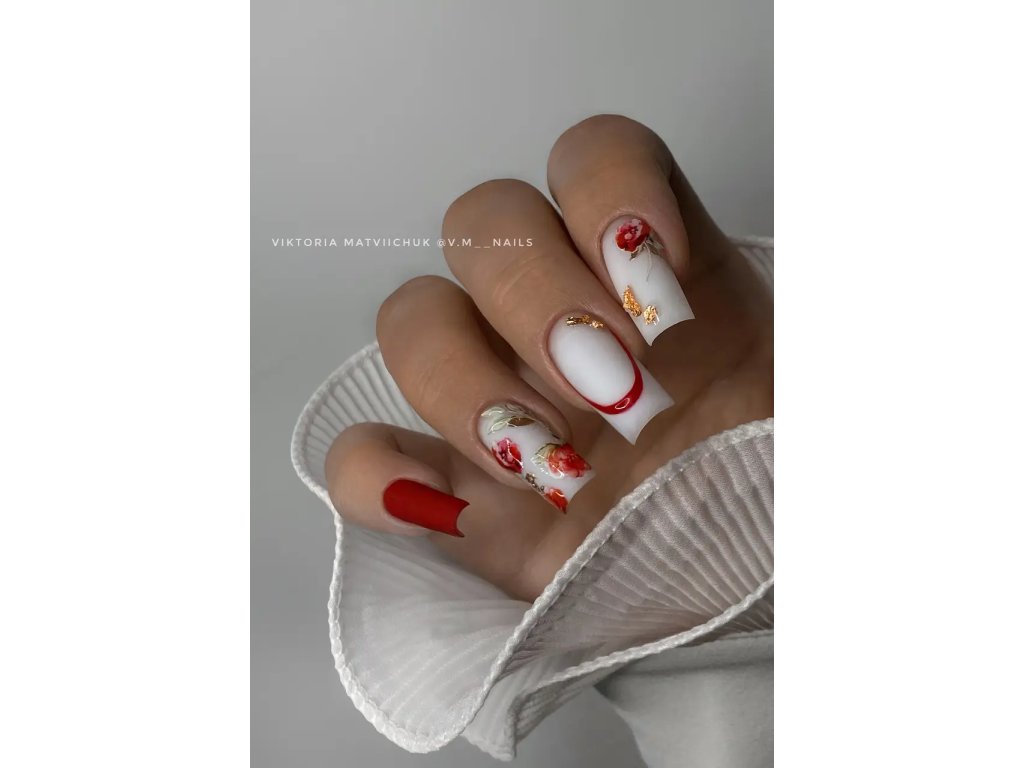 Opatrně přeneste na nehet a uhlaďte pomocí silikonového nástroje nebo prstu. Vyrovnejte případné bublinky.Zafixujte top coatem: