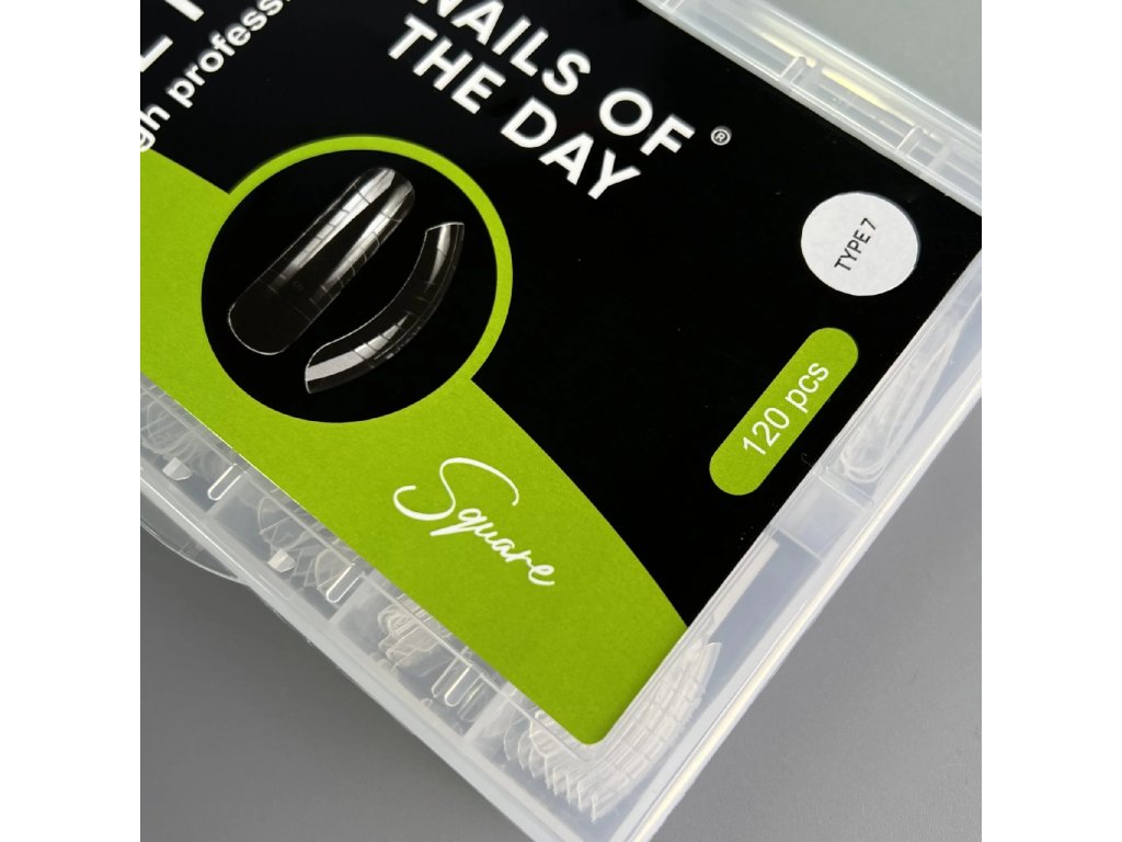 Typ 7 – čtverec pro střední délku modeláže, vhodný také pro nehty rostoucí směrem dolů. Balení obsahuje 120 kusů ve 12 velikostech, což umožňuje snadné přizpůsobení jakémukoli typu nehtové ploténky.