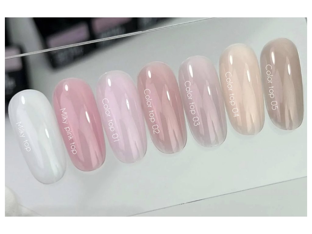 Nailsoftheday Color Top jsou stylové nude odstíny kamuflážních topů vytvořené týmem Nailsoftheday. Poskytují dokonalý vysoký lesk a přirozený efekt bez nutnosti použití barevného gel laku.