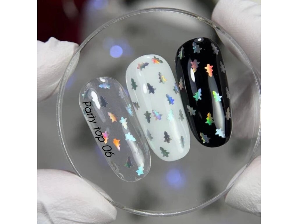 NAILSOFTHEDAY Party top 06 je efektní vrchní závěrečný top coat z řady Party, který po vytvrzení vytváří hustě posetý třpytivý povrch s výrazným dekoračním efektem. Jeho střední konzistence se dobře samovyrovnává a po polymeraci v lampě nezanechává lepivou vrstvu (no-wipe), čímž okamžitě vytváří odolný a extrémně lesklý finiš.