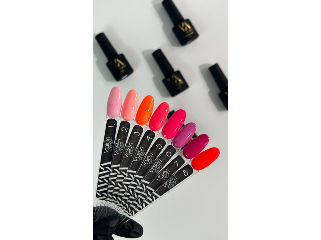 Valeri Color (gel laky) 6 mlCharakteristikaGel laky Valeri jsou vysoce kvalitní pigmentované gel laky, které se snadno samovyrovnávají, dobře se nanáší a tvrdnou v lampě. Při správné aplikaci může většina barev poskytovat plné krytí již v jedné vrstvě. Mají ideální středně hustou konzistenci, která zabraňuje stékání do kůžičky a postranních válců. Gel laky jsou velmi dobře pigmentované, nezanechávají šmouhy a rovnoměrně se roztírají na nehtové ploténce. Dostupné jsou v ekonomickém objemu, který umožňuje mít širokou paletu barev; každá lahvička vystačí na 18-20 aplikací.Technologie aplikace- Připravte nehtovou ploténku odstraněním předchozího laku, zmatněním, úpravou tvaru a provedením manikúry.